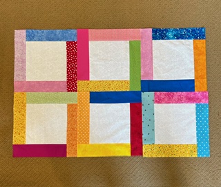 @bikergrammy is making two quilts for this quilt along! She made one in baby quilt size using a fun vintage toys print for the center squares and surrounded them by strips with bold colors and a subtle print. This one is SEW cool! Her other quilt uses the traditional lighter background. Her foreground strips have a cool 1800’s reproduction look that I’m loving.
